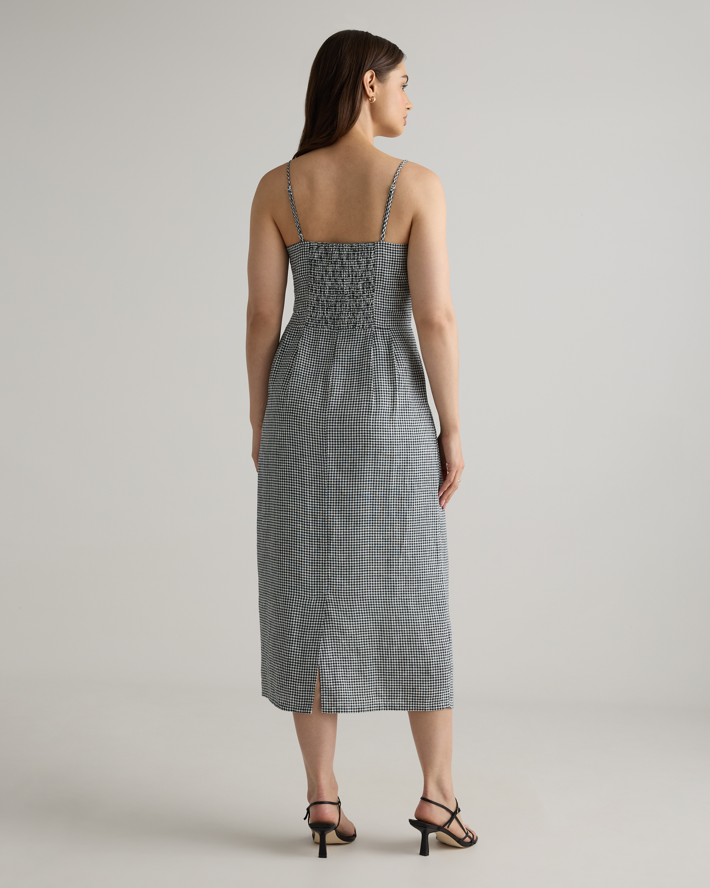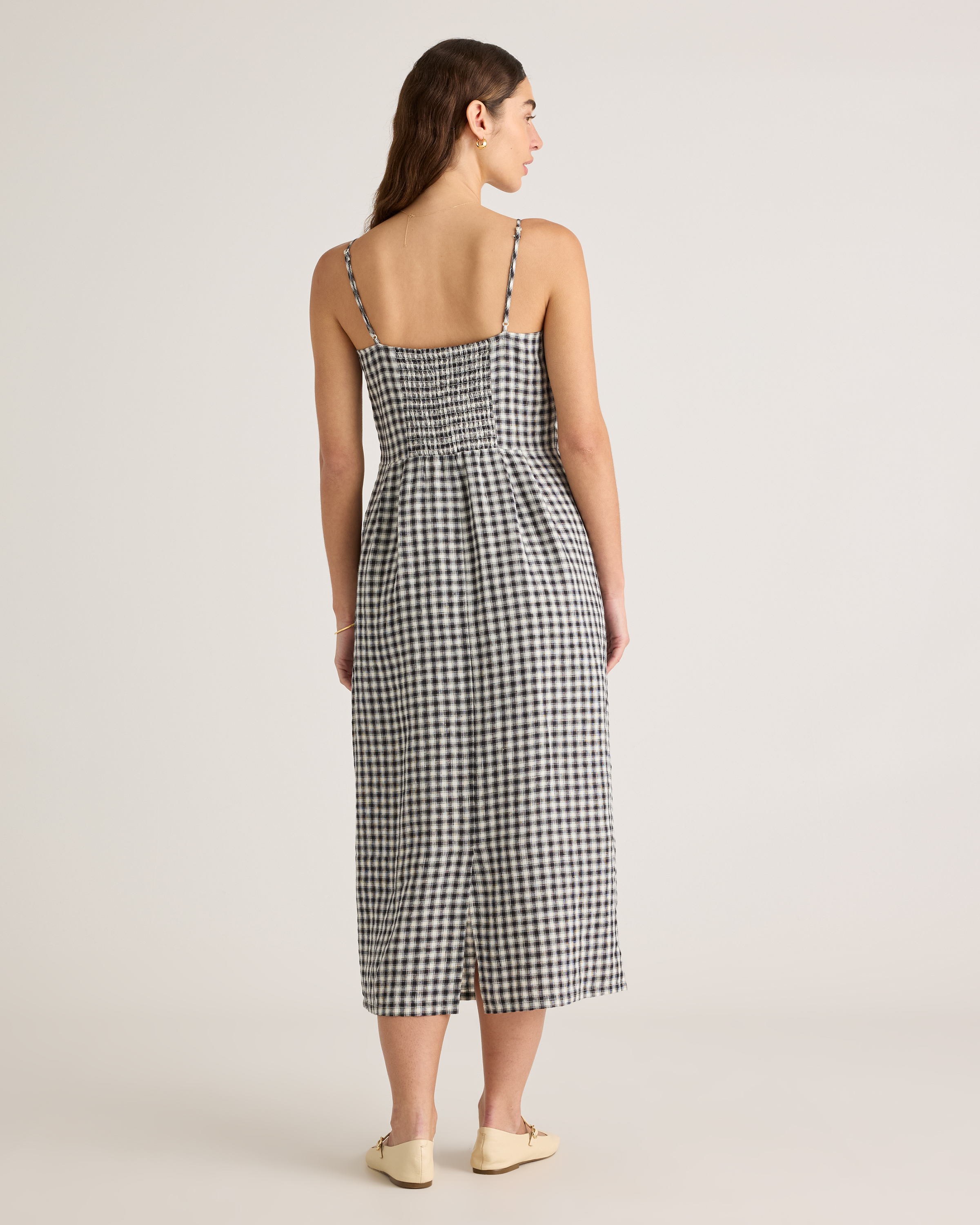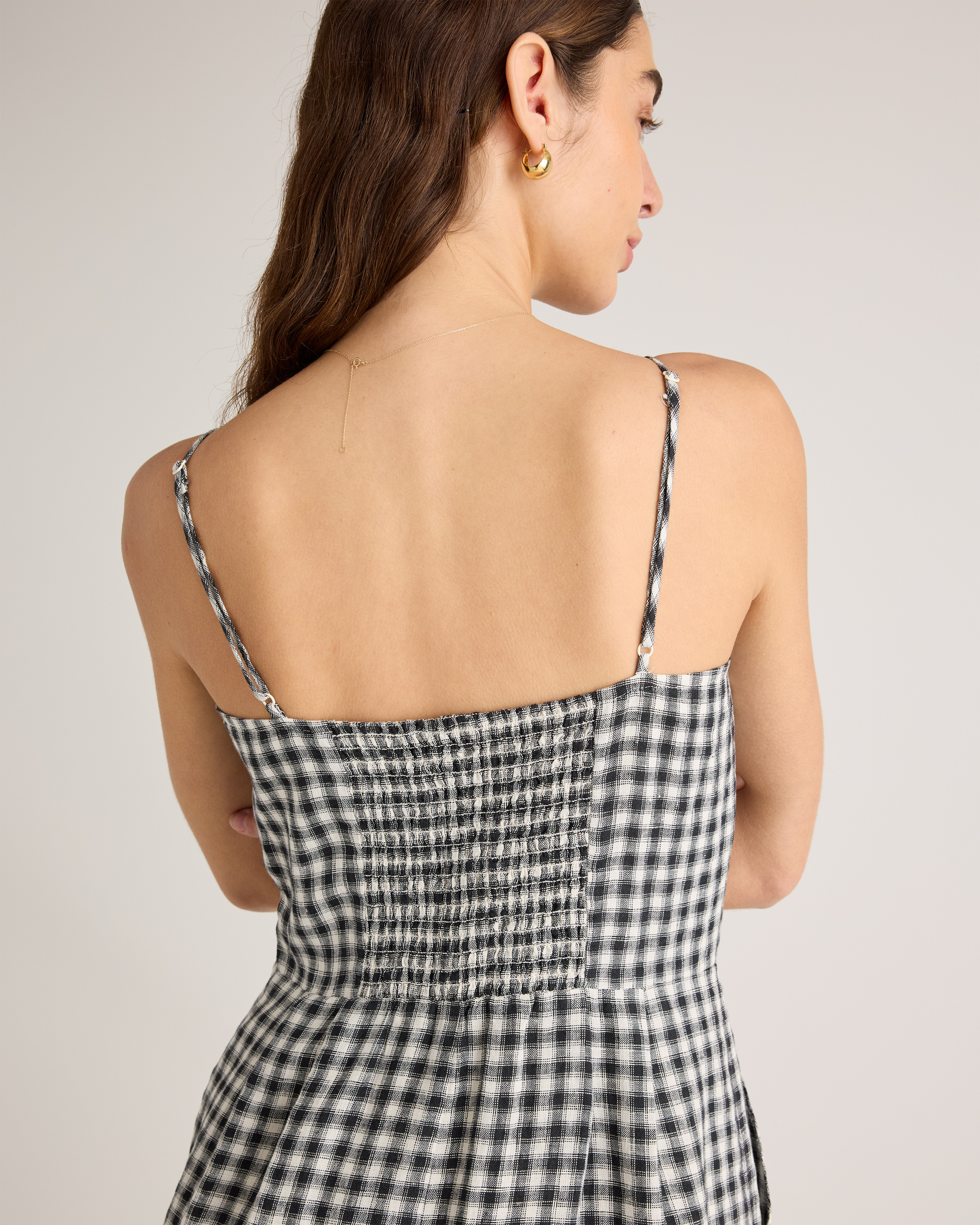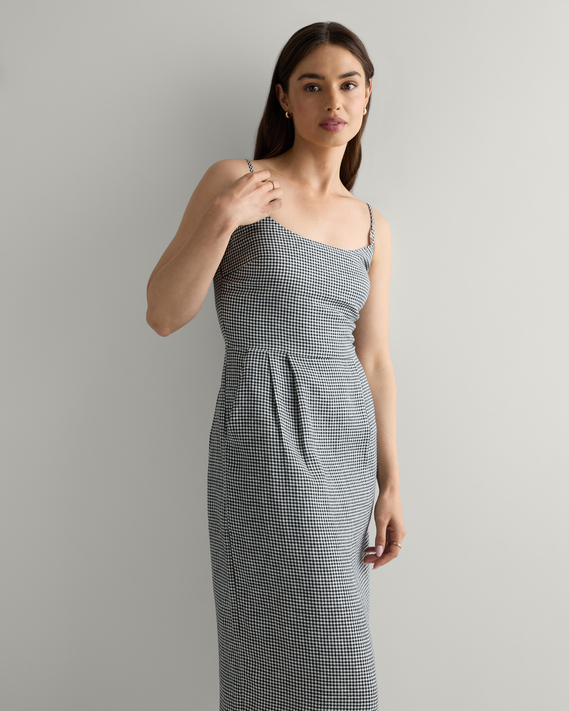 Model is 5'9" and wearing size small in deep navy, khaki / black gingham, blue pinstripe, soft yellow, chocolate, classic mini gingham, floral waterfall, and mauve mist