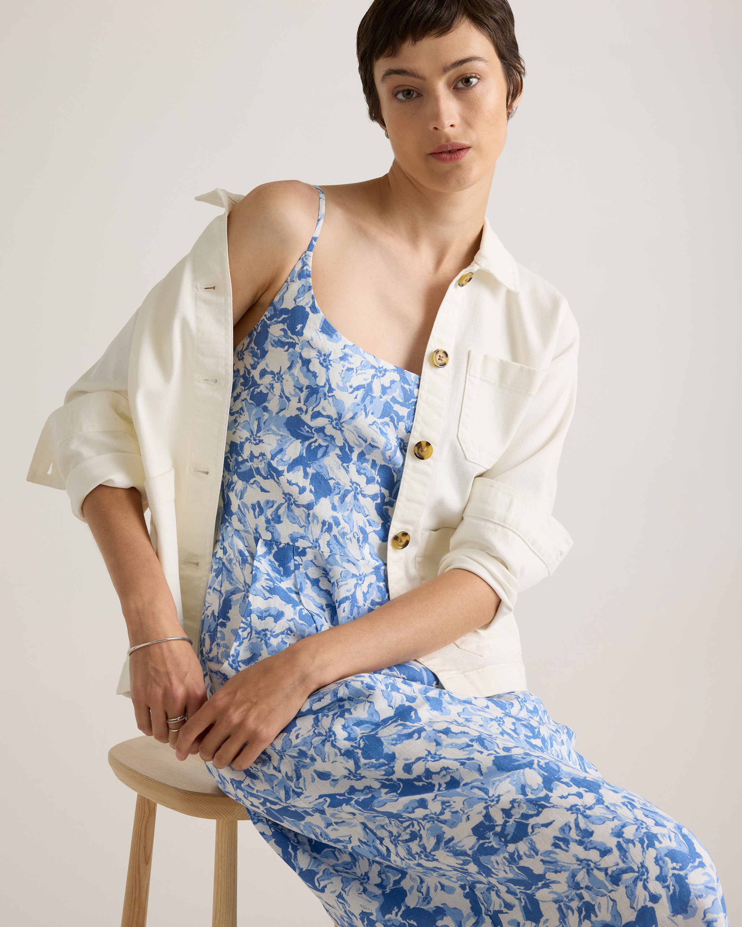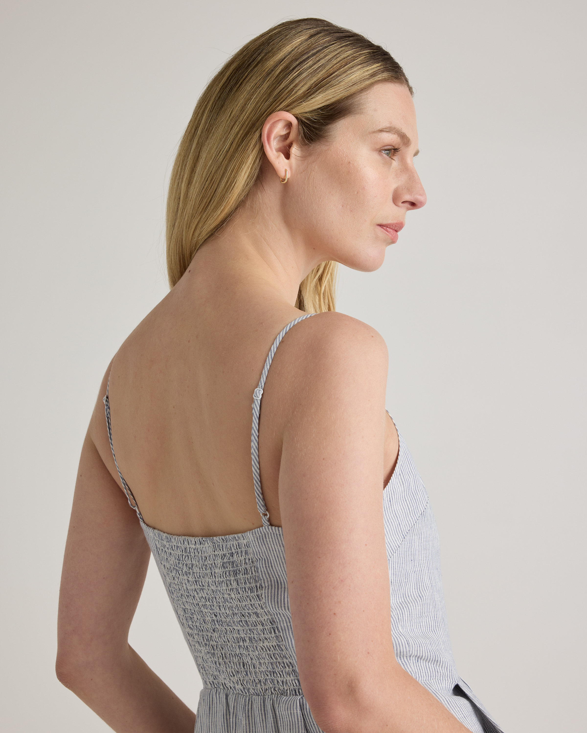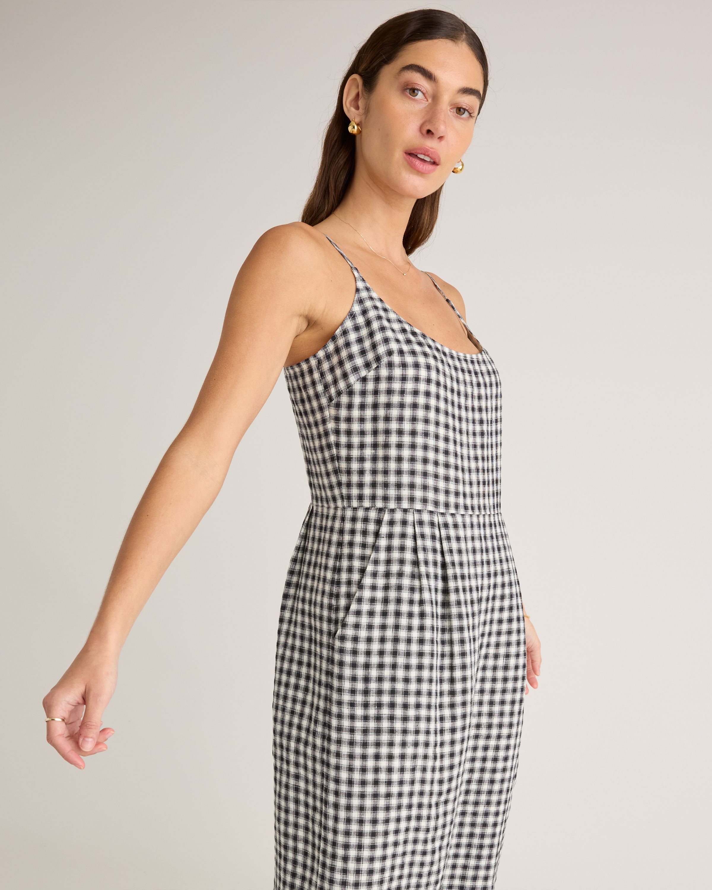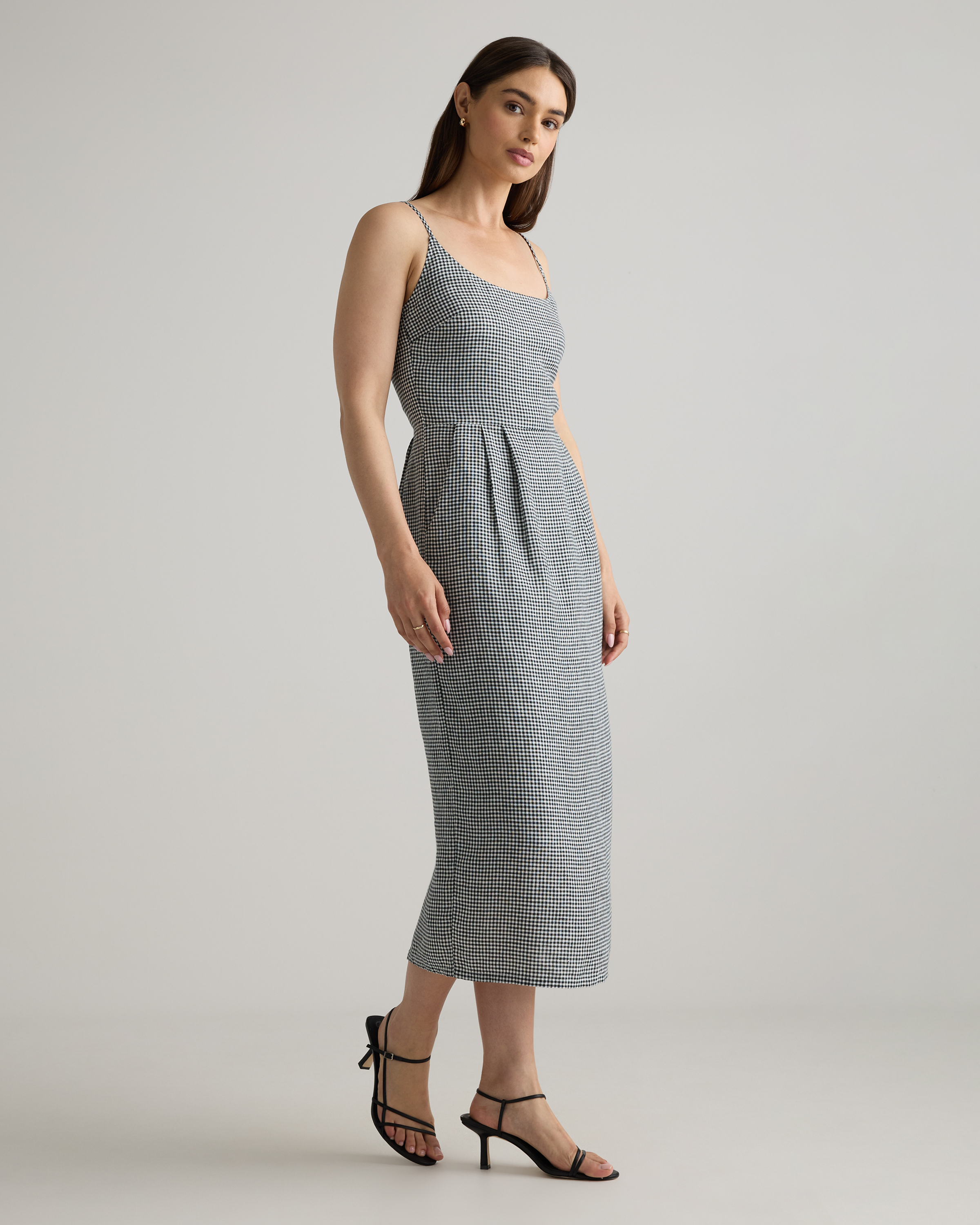 Model is 5'9" and wearing size small in deep navy, khaki / black gingham, blue pinstripe, soft yellow, chocolate, classic mini gingham, floral waterfall, and mauve mist