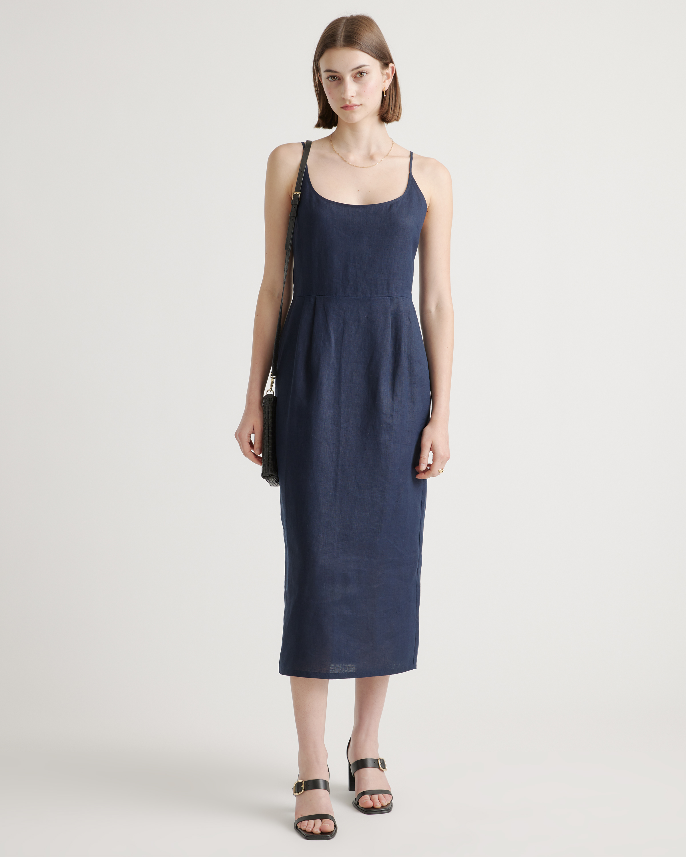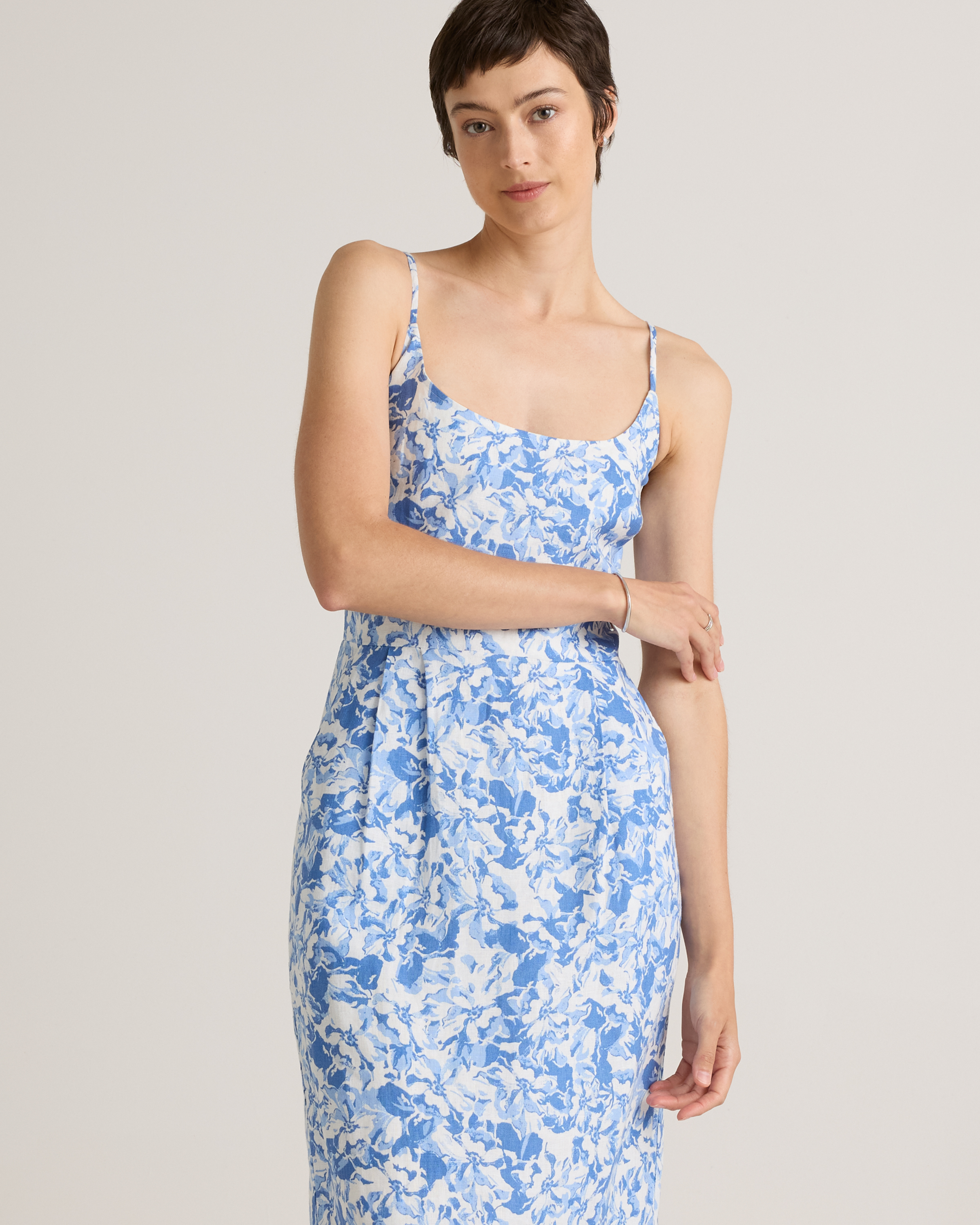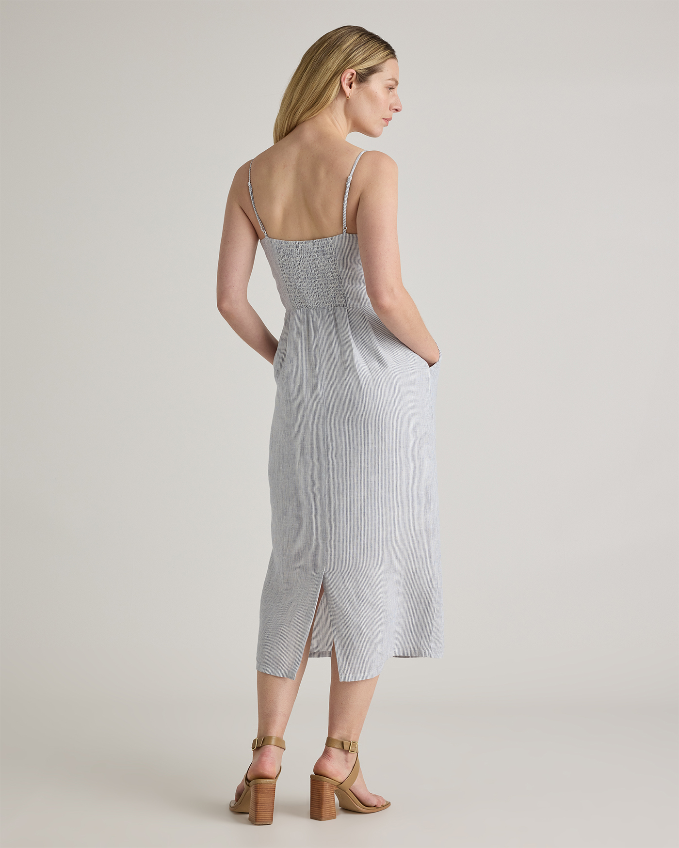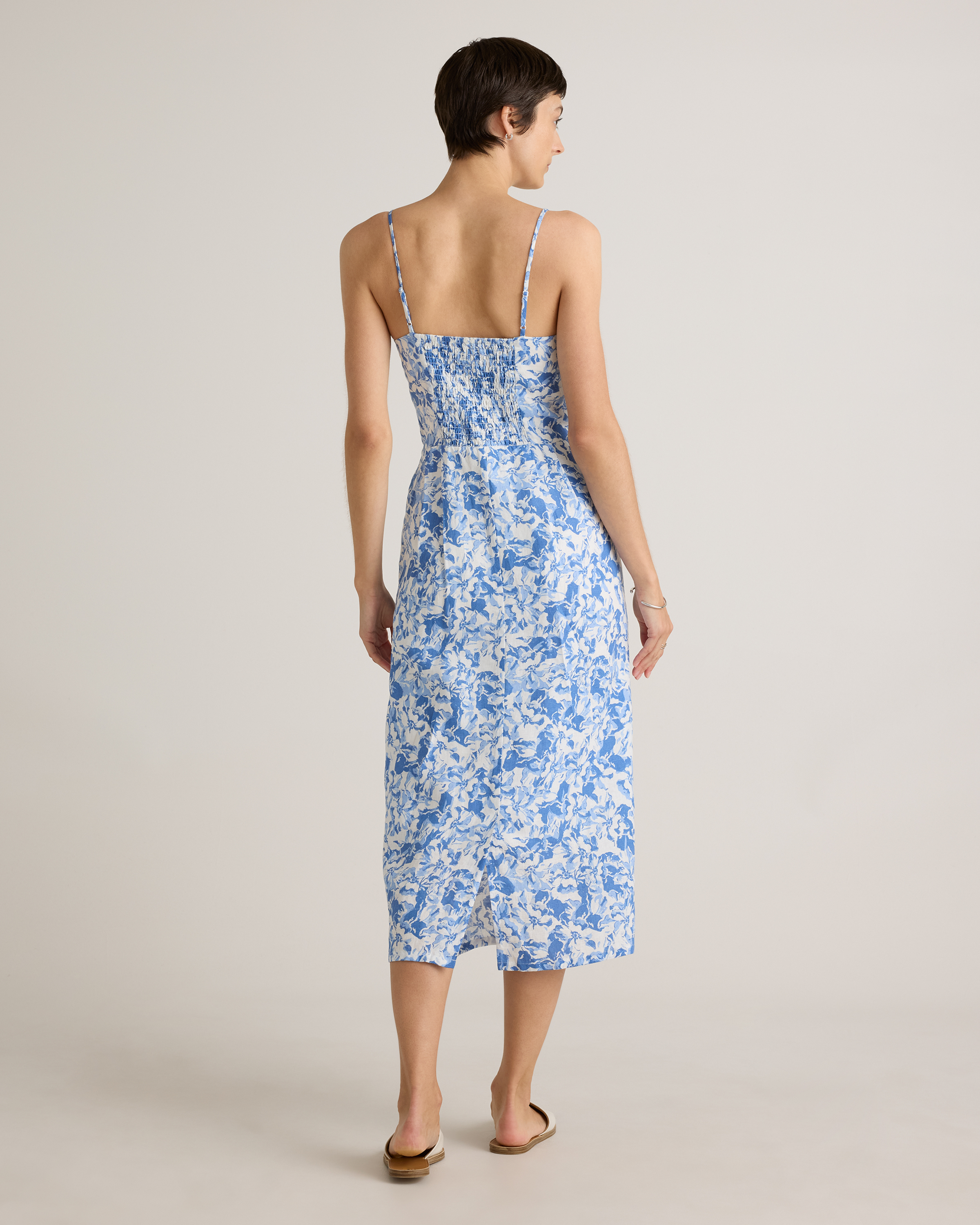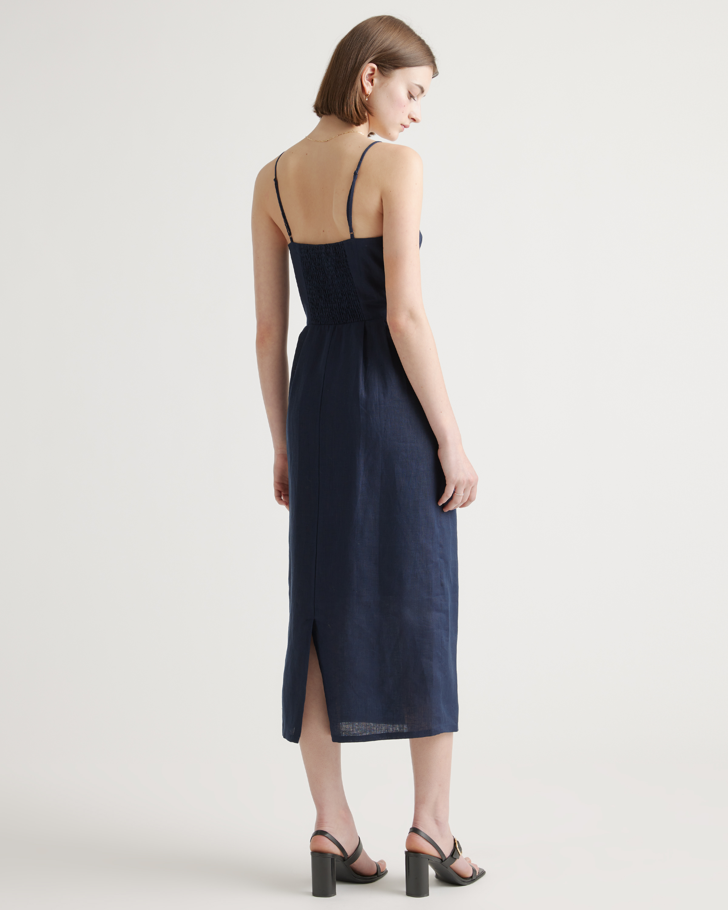 Model is 5'9" and wearing size small in deep navy, khaki / black gingham, blue pinstripe, soft yellow, chocolate, classic mini gingham, floral waterfall, and mauve mist